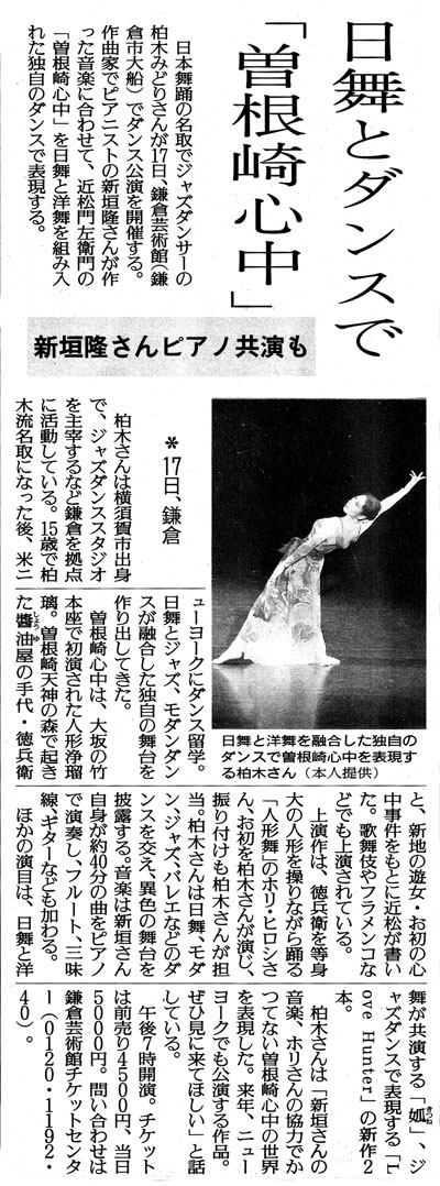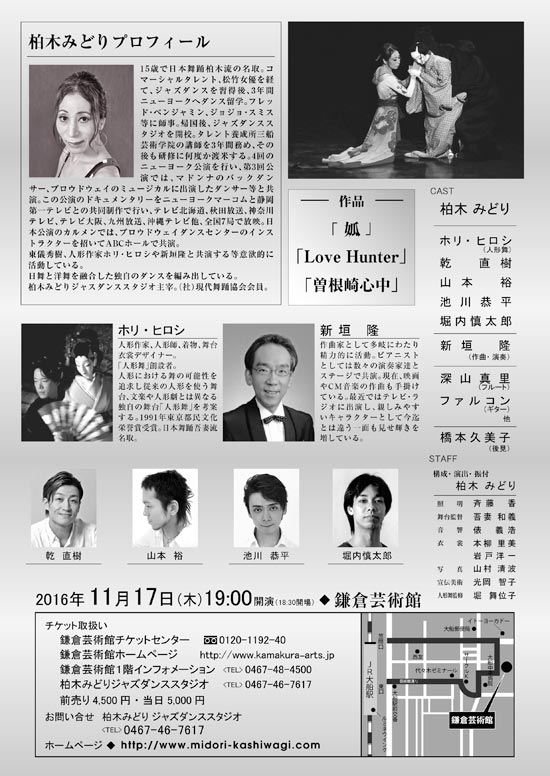 柏木 みどり ホリ・ヒロシ<人形舞> 乾 直樹 山本 裕 池川 恭平 堀内 慎太郎 新垣 隆<作曲・演奏> 深山 真里<フルート> ファルコン<ギター>他 橋本久美子<後見>