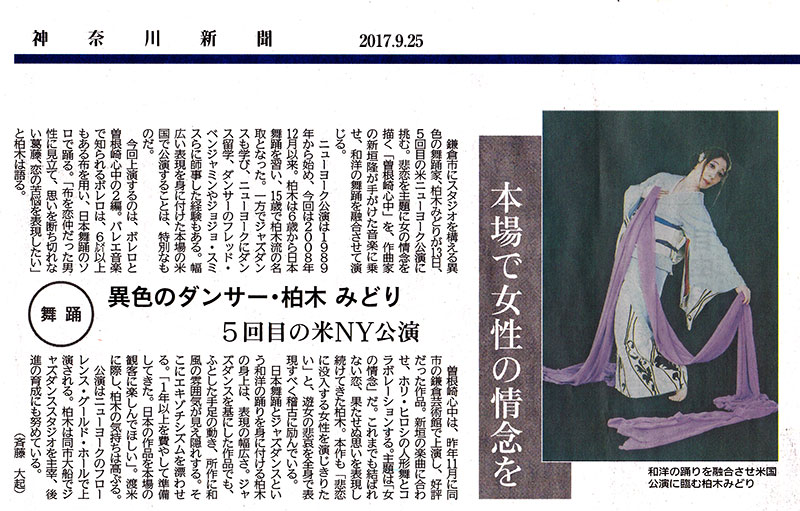 Midori Kashiwagi determined to learn traditional Japanese dance from the age of six, and received the master of Kashiwagi Style, the historical Japanese dance style with over two centuries of tradition, when she was fifteen. she has played on commercials and become an actress through the SHOCHIKU Co.,Ltd. After learning jazz dance in Japan, she went to New York to study under Fred Benjamin and JoJo Smith, among others, and then opened her own dance studio in Japan. After working at the Mifune Art Institute, the entertainer’s training school founded by the world famous actor, Toshiro Mifune, as a professor for three years, she traveled to the United States several times for further training. She has created and shown her original dance pieces, combining traditional Japanese dance, jazz dance, modern dance and more, every year in both Japan and New York. Her dance and performances have been shown in New York four times and have been reviewed in the New York Times, Village Voice, Attitude Magazine, and others. At the third performance, she collaborated with dancers from various Broadway Musicals, backup dancers for Madonna, instructors at the Broadway Dance Center in NY, and others. This performance will be shown in a documentary through Marcom Global Vision, LLC, in New York, and Shizuoka Daiichi Television Corporation in Japan, and will be broadcast nationwide in Japan